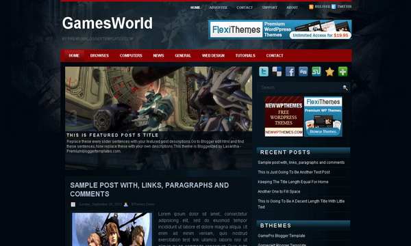 Template type : 1 Sidebar, 2 Column, Adapted from WordPress, Blue, Featured Section, Fixed width, Header Banner, Magazine, Right Sidebar, Slider, Top Navigation Bar, Elegant Release date : September 11, 2010 Coder/Designer Name(s) : Lasantha Bandara / New WP Themes Coder/Designer URL(s) : http://www.premiumbloggertemplates.com/ Basic Instructions : How to install a Blogger template Advanced Details : http://www.premiumbloggertemplates.com/2010/09/games-world-blogger-template.html |