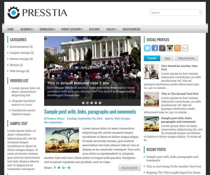 Presstia is a 3 Columns Multipurpose Responsive Blogger Template for General/Blog Websites. Presstia Blogger Template has a Featured Posts Slider, 2 Dropdown Menus, Header Banner Widget, Related Posts with Thumbnails, Breadcrumb, Social and Share Buttons, Google Fonts, Left and Right Sidebars, 3 Columns Footer, Tabbed Widget and More Features.