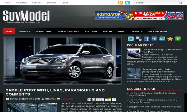 Template type : 1 Sidebar, 2 column, Adapted from WordPress, Elegant, Featured Section, Fixed width, Header Banner, Magazine, Red, Right Sidebar, Slider, Top Navigation Bar, Web 2.0, Auto, Cars Release date : September 30, 2011 Coder/Designer Name(s) : Lasantha Bandara / New WP Themes Coder/Designer URL(s) : http://www.premiumbloggertemplates.com/ Basic Instructions : How to install a Blogger template Advanced Details : http://www.premiumbloggertemplates.com/2011/09/suvmodel-blogger-template.html |